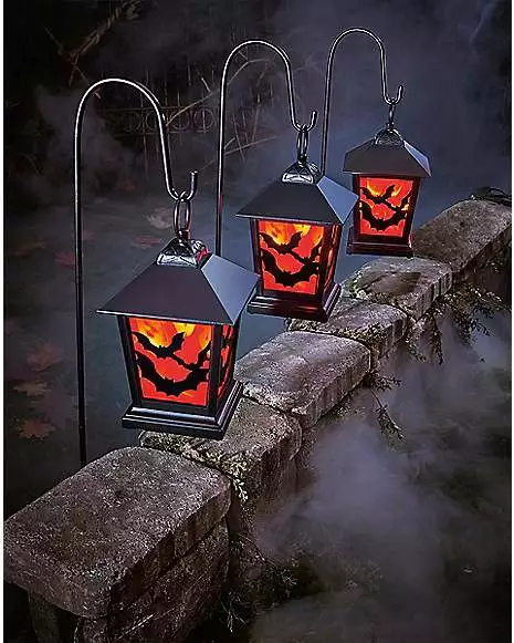 Light up your walkway with these eerie pathway markers! This set includes 3 LED light lanterns that cast a fiery glow. Black bats adorn each lantern, creating a chilling scene.