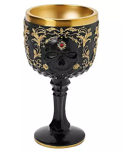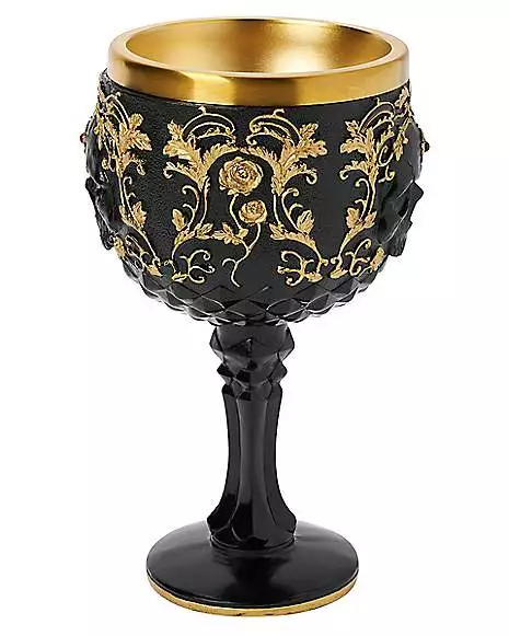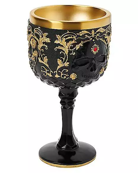 Sip in skeletal style with this Gothic Noir Skull Goblet! This ghoulish goblet features a black exterior detailed with ornate goldtone vines and roses and a magnificent goldtone interior. For a goblet fit for royalty, this goblet fits the bill.